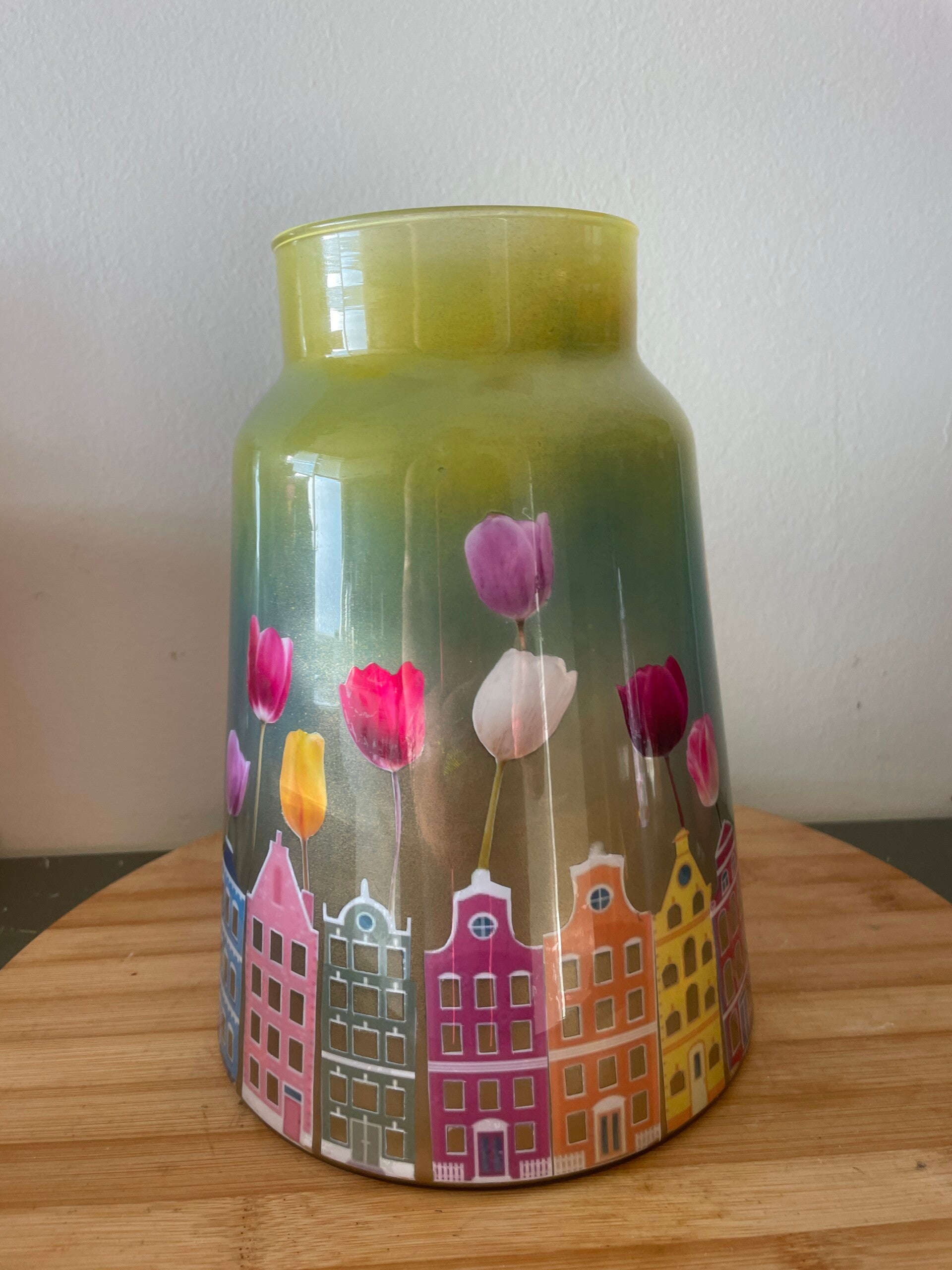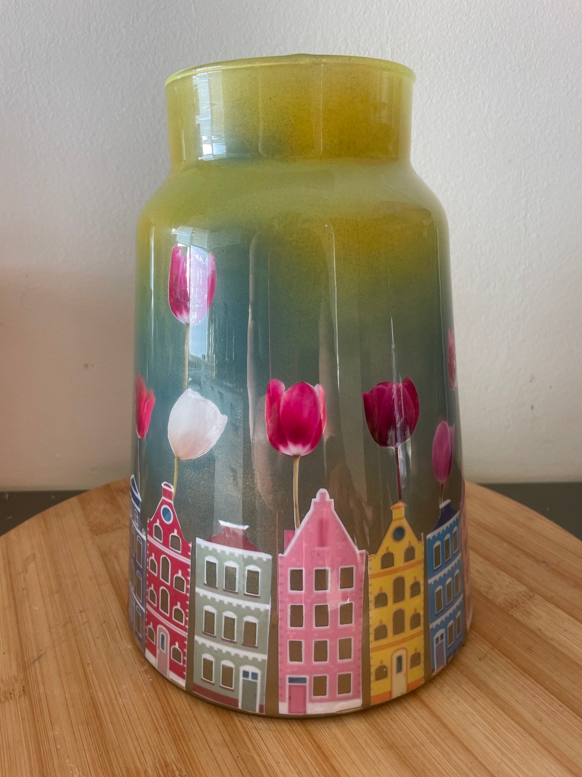 De Amsterdam vaas is geschikt voor verschillende doeleinden: uiteraard als vaas (wel met binnenvaas), door de verloop van kleuren en de uitgesneden raampjes is hij ook fantastisch als windlicht! Of natuurlijk prachtig als decoratieve eyecatcher in een vakkenkast!