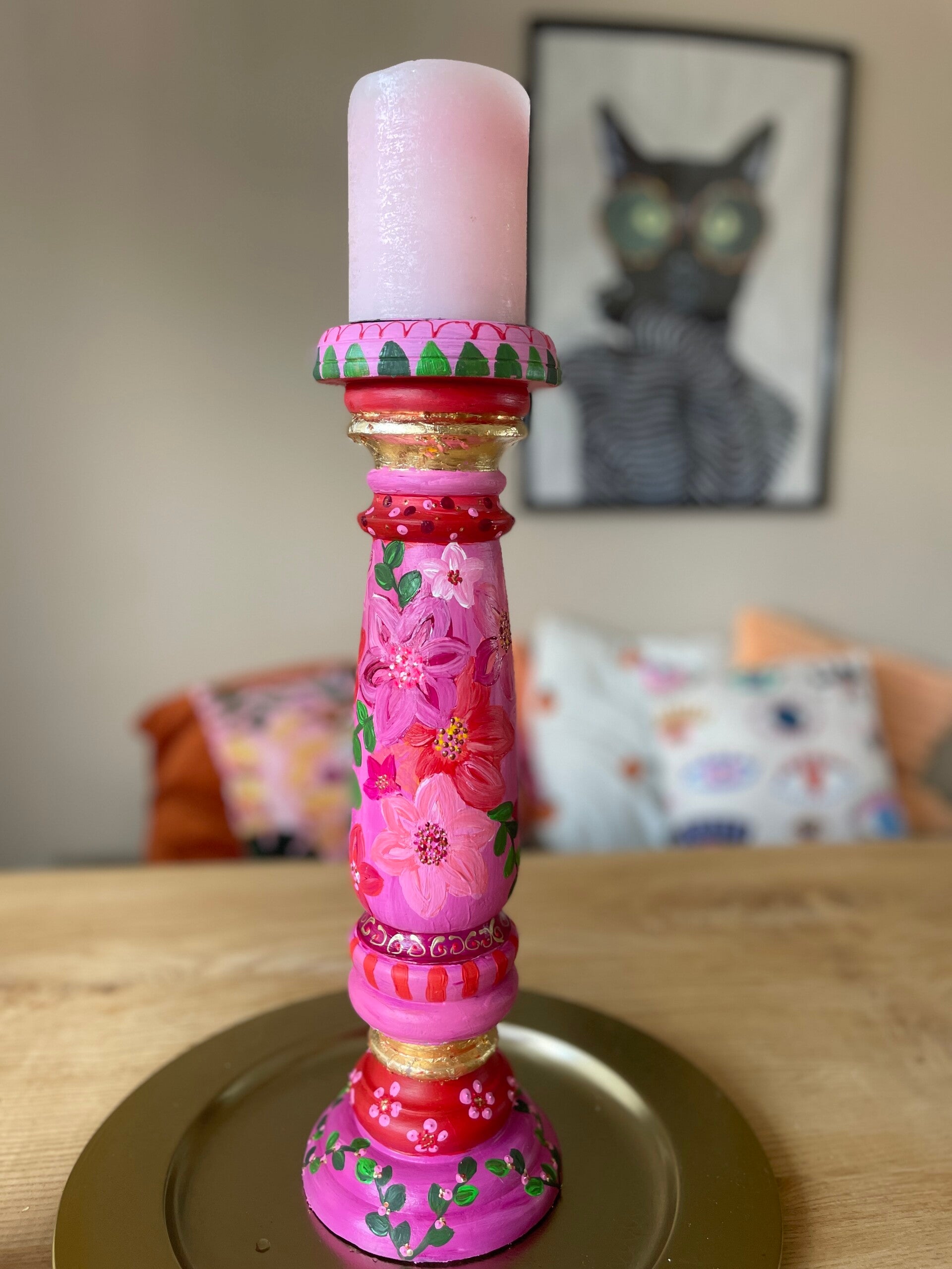 Deze prachtig beschilderde kandelaar heeft een tweede leven gekregen! Het is een echte eyecatcher voor in jouw interieur, of misschien in die van iemand die je kent😉.Kandelaar bloem is uniek, omdat er maar 1 van is!