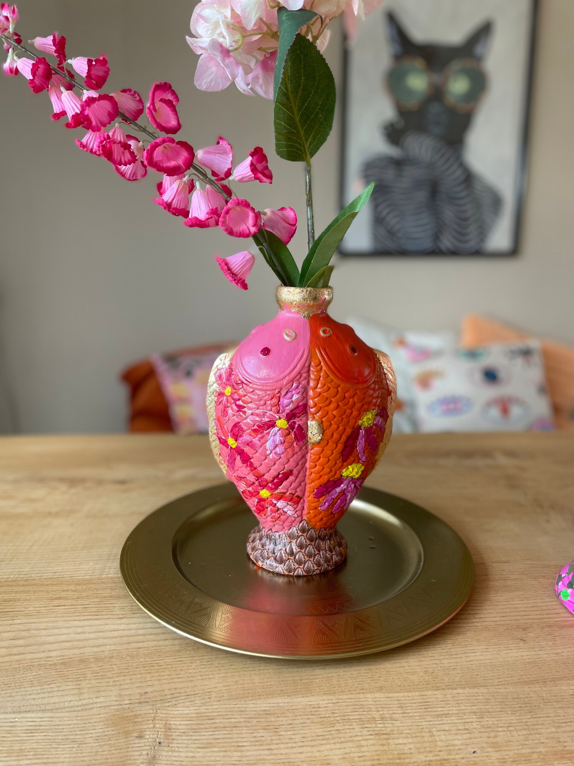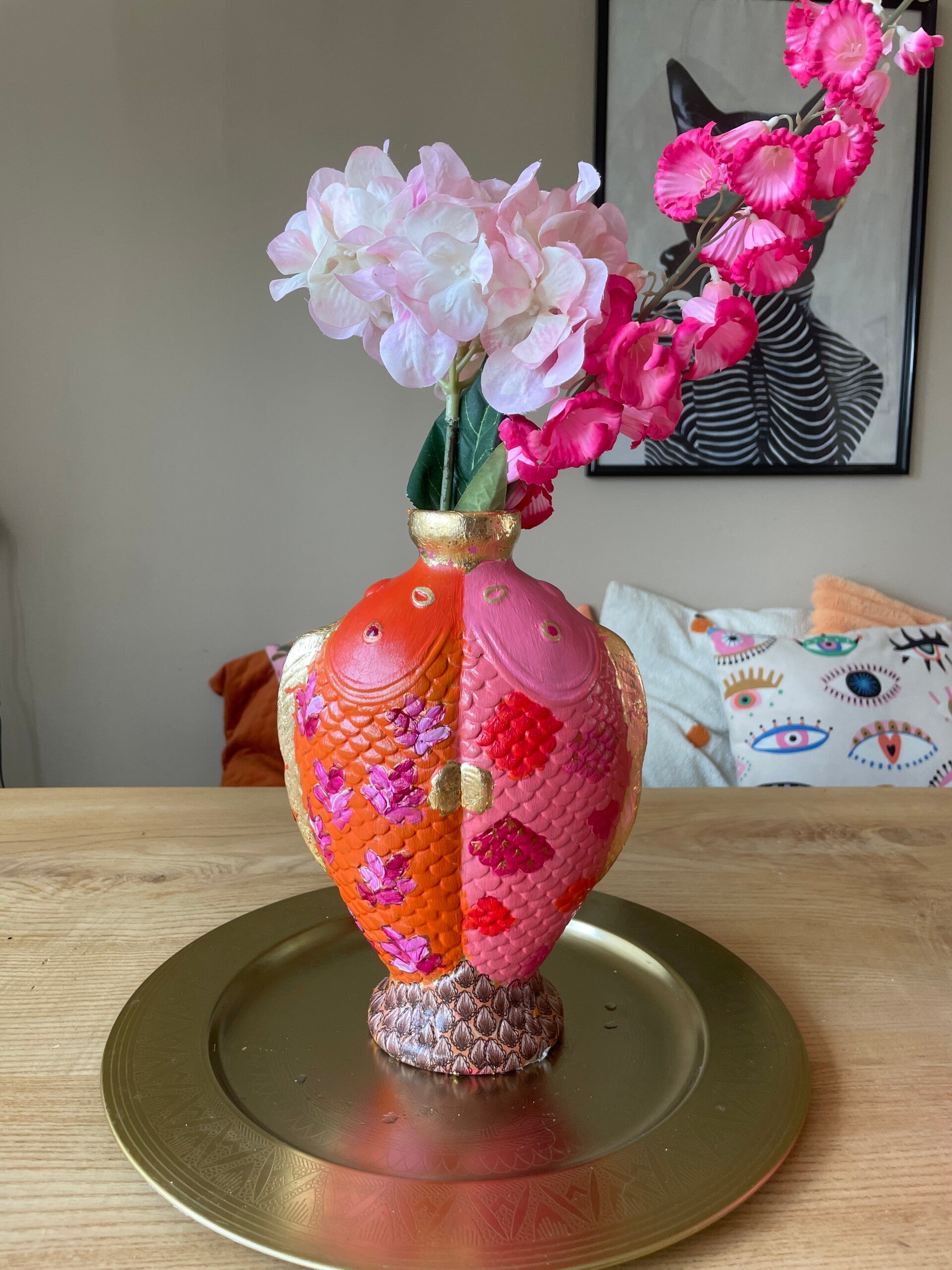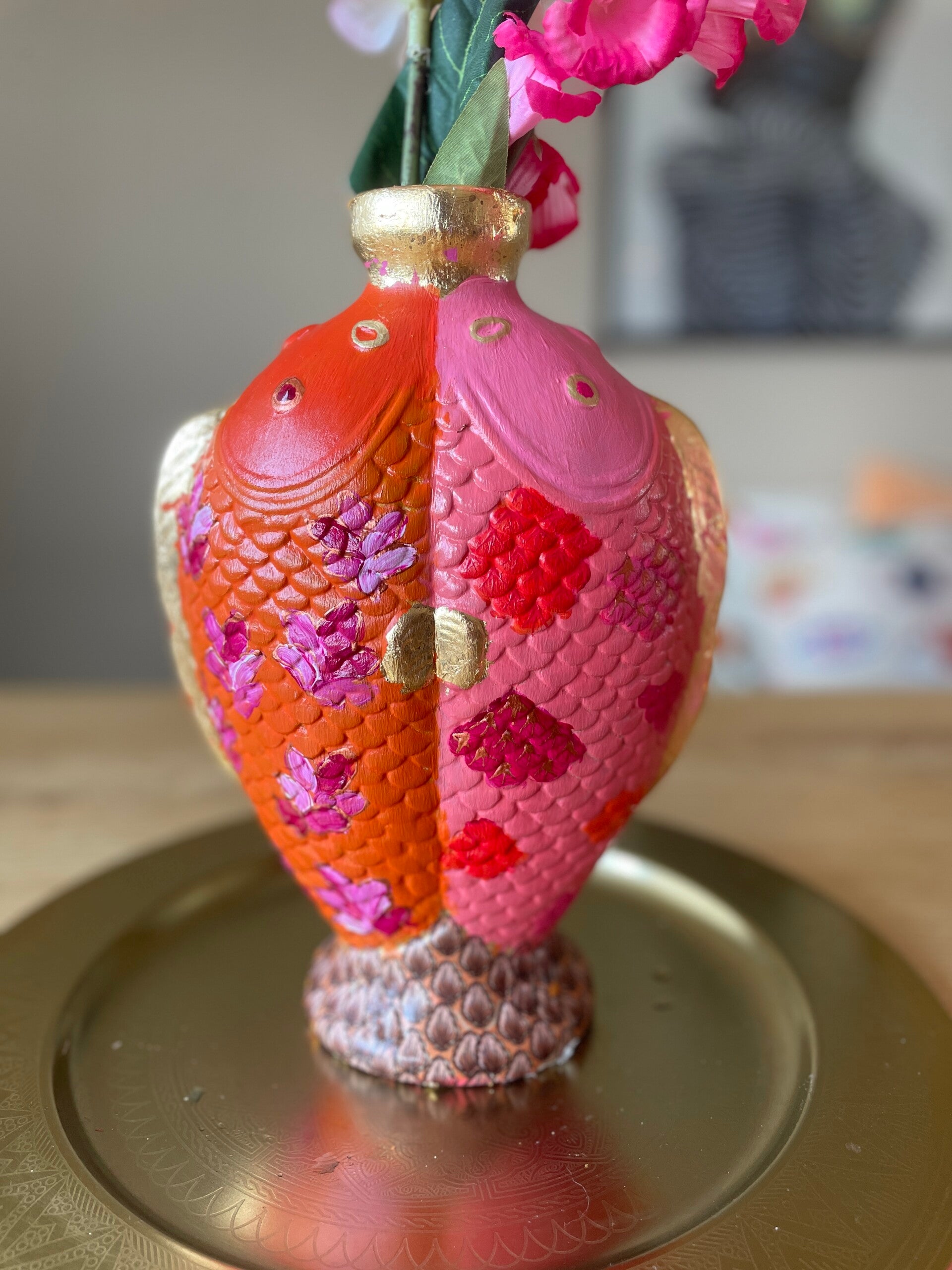 Deze handbeschilderde vaas is een echte eyecatcher, van een fuchsia roze vis tot deze prachtige unieke vaas gecombineerd met verschillende soorten technieken. Hij maakt jouw interieur een knaller! Is dit geen hit? 🐠🩷