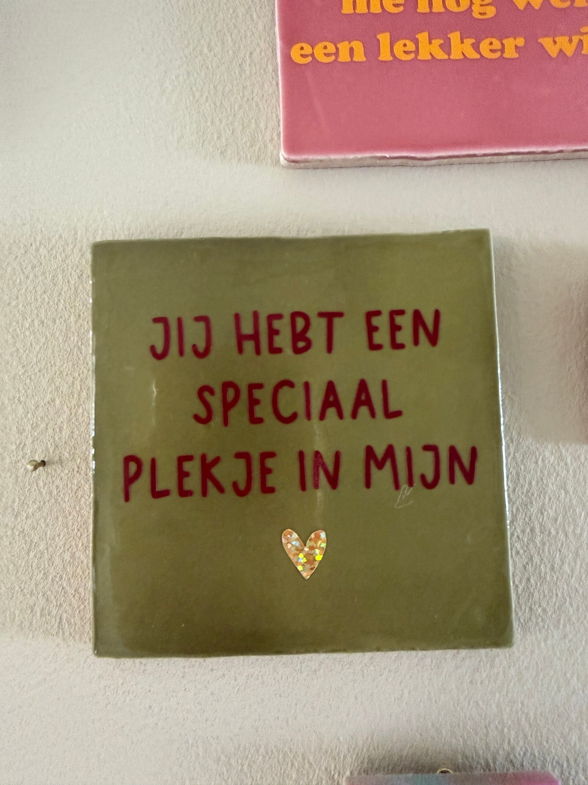 Een lief tegeltje met een knipoog. De tekst “Jij hebt een speciaal plekje in mijn…” met het hartje eronder laat de rest lekker aan de fantasie over. Perfect om iemand te laten glimlachen of als subtiel grappig cadeautje.
